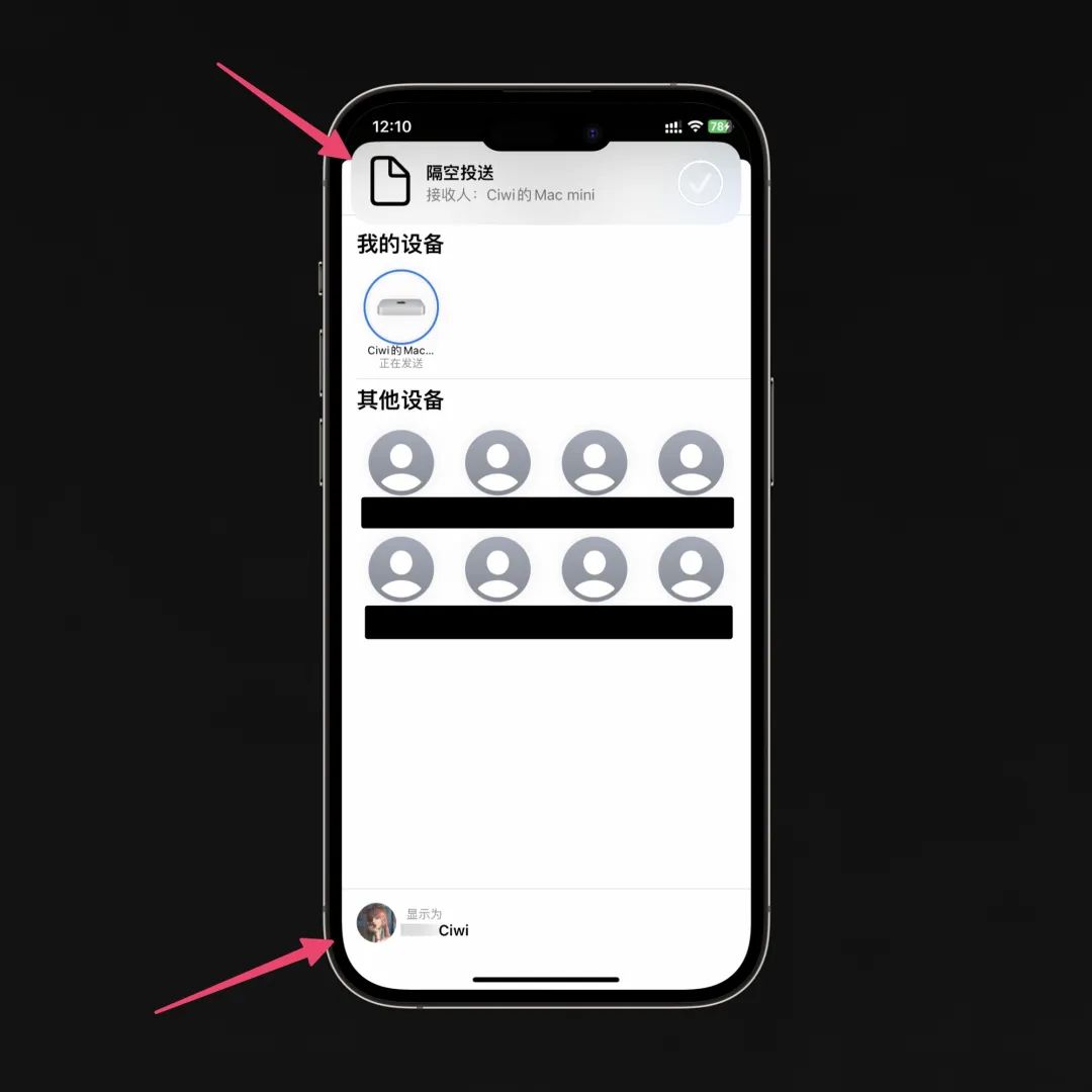 此外, AirDrop 頁面稍微有點變化,頂部有投送的狀態欄,底部有你的 ID 。