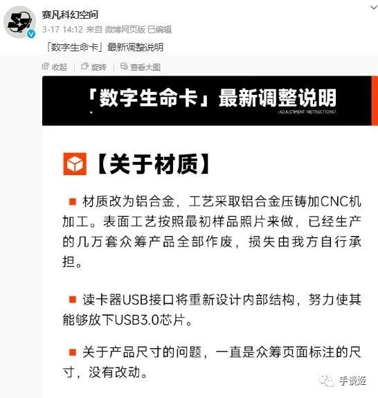 數字生命卡首先被曝出的是其偷換材料的信息,一開始賽凡在眾籌信息裏寫的是周邊將使用鋁合金材質,但在3月份的一次更新中,卻表示要改為鋅合金材質。