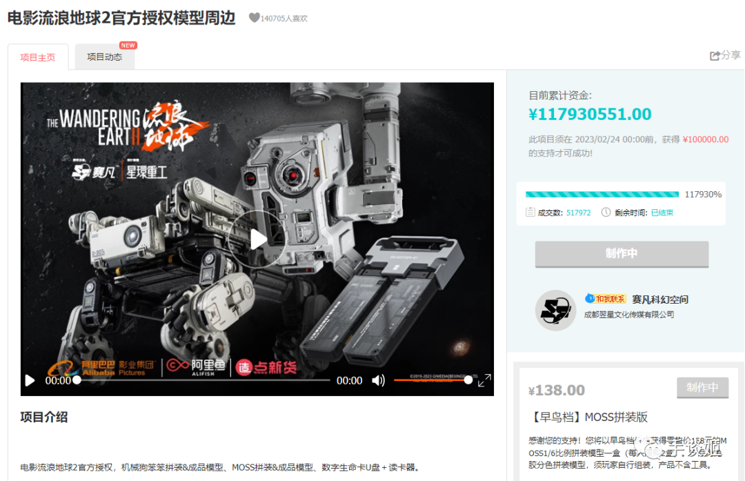 觀眾看完《流浪地球2》激動啊,喜歡啊,情感溢於言表,就想要進行一個消費。而這批周邊商品很快就完成了10萬的眾籌目標,並且達到了目標的1000倍,也就是一個億。在王健林都不敢再這麼定小目標的環境下,周邊眾籌卻實現了,足見觀眾的熱情。
