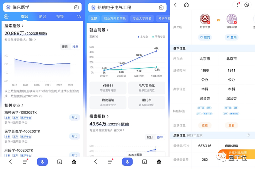 今年,百度還基於AI技術,首次推出了高考搜索指數,涵蓋專業搜索熱度及變化趨勢、“院校PK”等信息。考生家長在擇校選專業的時候,可以更方面地參考對比。