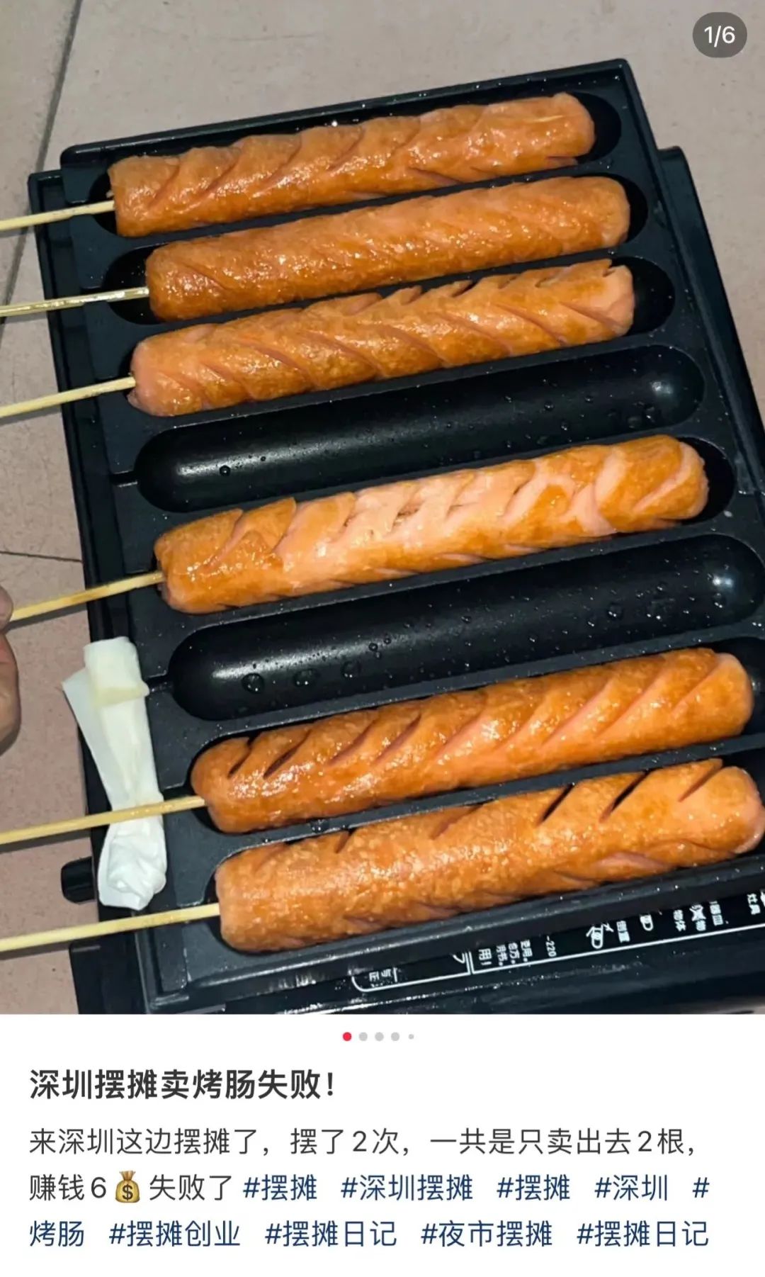 在社交媒體上搜索“烤腸”,一半帖子都是勸退。有人第一次出攤只賣了兩根6塊,剩下的幾十根只能自己炫了;有人出攤不到半小時趕上了下雨;還有不少人抱怨,今年賣烤腸的越來越多,擺攤十家有八家是烤腸,市場已經飽和。