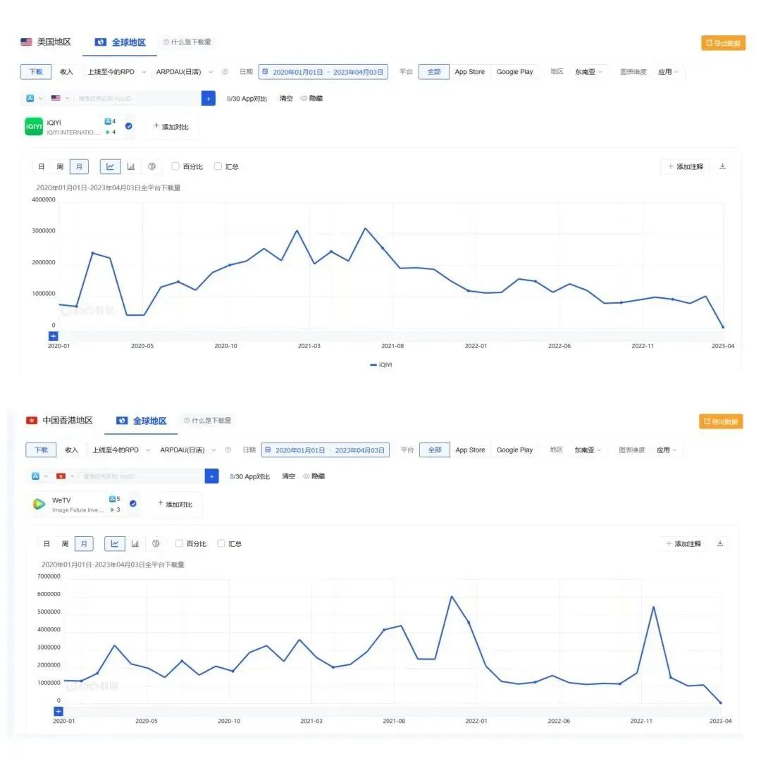 據點點數據,WeTV與IQIYI在東南亞地區2022年的下載量在一百萬上下浮動,但在前一年,兩家平台的下載量均維持在兩百萬以上。