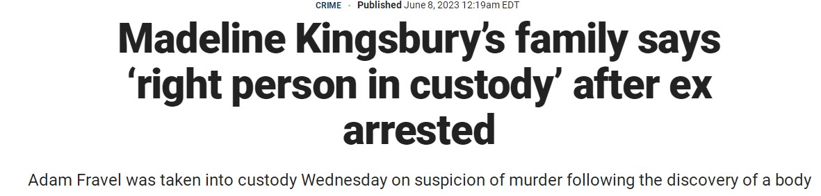 據福克斯新聞網報道,明尼蘇達州失蹤母親麥德琳-金斯伯裏(Madeline Kingsbury)的家人説,他們相信 “正確的人被拘留了”,此前警方確認逮捕了3月份神秘失蹤的26歲女孩的父親和前合夥人(譯註:根據原文直譯是女孩的父親,但我個人認為是失蹤女孩的孩子的父親,即失蹤女孩的前合夥人(partner),因未結婚,所以不能叫前夫,只能叫前合夥人)。
