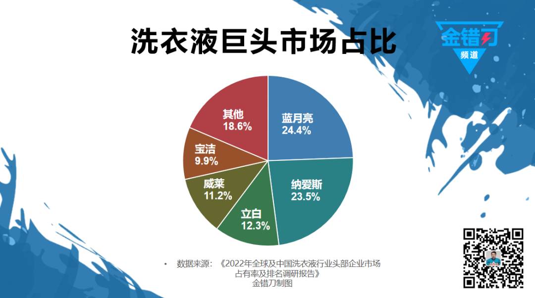 活力28被雪藏的同時,藍月亮、納愛斯、威露士迅速搶奪用户,一邊在全國商超渠道瘋狂鋪貨,一邊集體猛攻直播,幾個巨頭霸佔快80%的市場。