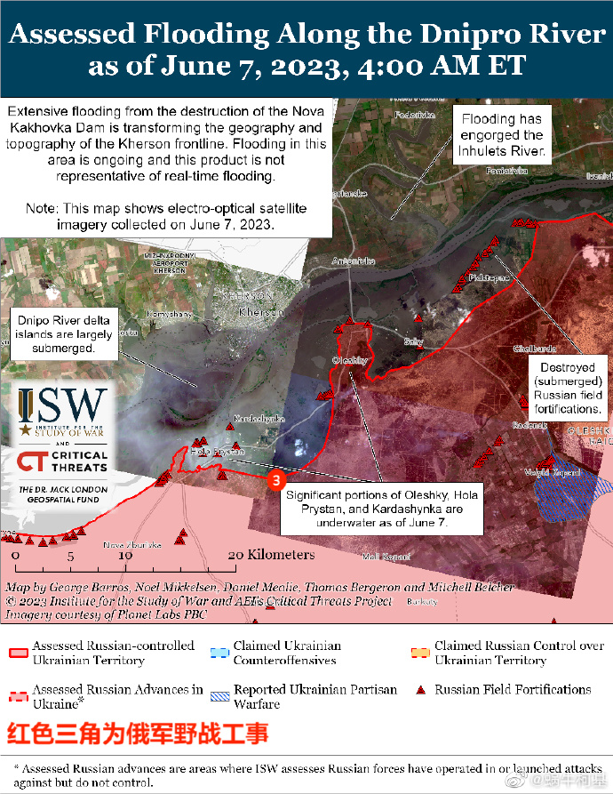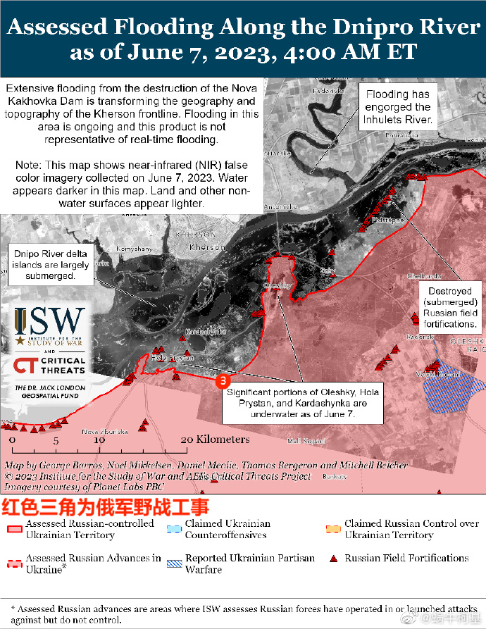 “卡霍夫卡水力發電廠 (KHPP) 大壩的毀壞正在顯着改變烏克蘭南部赫爾松前線地區的地理和地形。6 月 7 日凌晨四點拍攝的近紅外 (NIR) 圖像表明,洪水嚴重破壞了俄羅斯在第聶伯河東(左)岸準備好的防禦陣地——尤其是影響了俄羅斯在霍拉普利斯坦和 秋魯平斯克的一線陣地。各種消息來源報道説,秋魯平斯克、霍拉普利斯坦、科扎奇拉傑裏和德尼普里亞尼(全是左岸村鎮)幾乎完全被水淹沒,水位在某些地區上升到一層建築物的高度。 ”