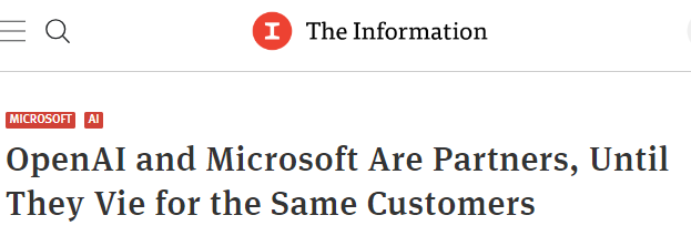 近日,根據《The Information》,微軟的一份內部文件指示 Azure 的銷售人員告訴客户微軟能比 OpenAI 提供更多的服務;而 OpenAI 則在通過延遲授予微軟產品 API 訪問權限、暫緩提供最新模型等方式,進行防禦。