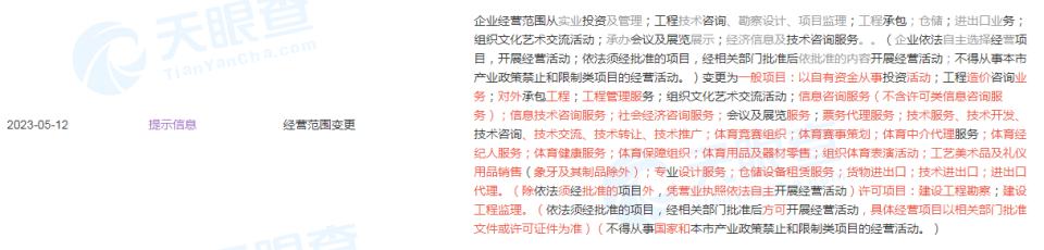 直至2023年5月,虹橋國際工商信息的經營範圍內才增加了體育競賽組織、體育賽事策劃、組織體育表演活動等。