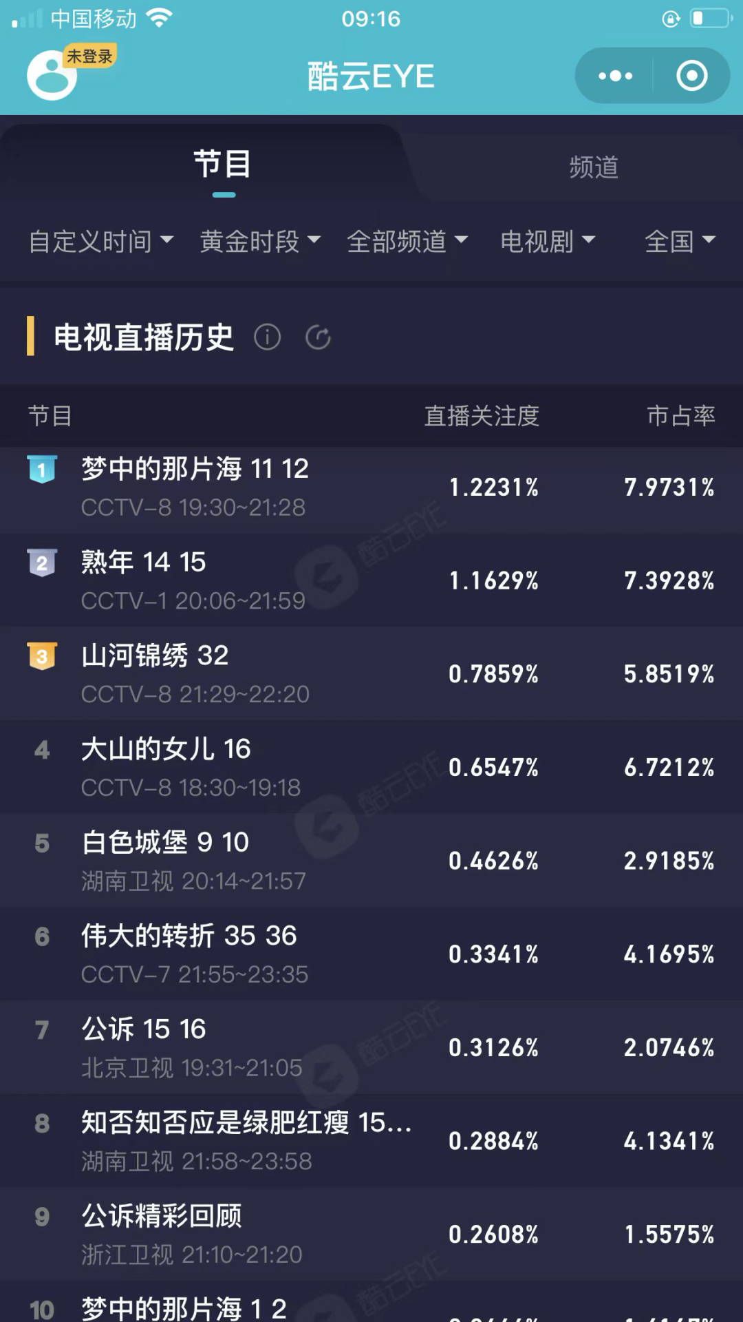 《夢中的那片海》則相對更加突出,首周平均收視率達1.4%,僅次於播出兩週的《熟年》和《一代匠人》,酷雲直播關注度則連續6天登頂,直播關注度在1.2-1.3%之間,高於排名第二位的《熟年》。從酷雲榜單上看,除了《山河錦繡》《大山的女兒》等老劇收視靠前外,上週登陸湖南衞視的醫療職場劇《白色城堡》也出現在前五名,主演彭冠英在Q1 憑藉現偶劇《聽説你喜歡我》小範圍出圈。