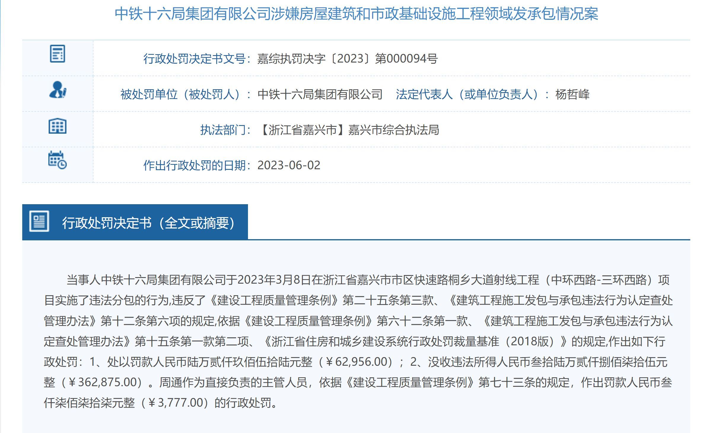 根據《中鐵十六局集團有限公司涉嫌房屋建築和市政基礎設施工程領域發承包情況案》透露:當事人中鐵十六局集團有限公司於2023年3月8日在浙江省嘉興市市區快速路桐鄉大道射線工程(中環西路-三環西路)項目實施了違法分包的行為,違反了《建設工程質量管理條例》第二十五條第三款、《建築工程施工發包與承包違法行為認定查處管理辦法》第十二條第六項的規定,依據《建設工程質量管理條例》第六十二條第一款、《建築工程施工發包與承包違法行為認定查處管理辦法》第十五條第一款第二項、《浙江省住房和城鄉建設系統行政處罰裁量基準(2018版)》的規定,作出如下行政處罰:1、處以罰款人民幣陸萬貳仟玖佰伍拾陸元整(¥62,956.00);2、沒收違法所得人民幣叁拾陸萬貳仟捌佰柒拾伍元整(¥362,875.00)。周通作為直接負責的主管人員,依據《建設工程質量管理條例》第七十三條的規定,作出罰款人民幣叁仟柒佰柒拾柒元整(¥3,777.00)的行政處罰。行政處罰決定書文號為嘉綜執罰決字〔2023〕第000094號。執法部門為嘉興市綜合執法局。
