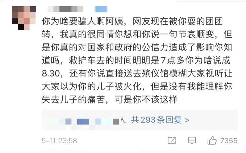 儘管孩子父親解釋了,母親的妝容純粹是出於銷售崗要求的職業套裝,依然未能讓誅心者閉嘴,更有大v直接蓋棺定論這位母親是在拿孩子的命索自己下半輩子的榮華富貴。
