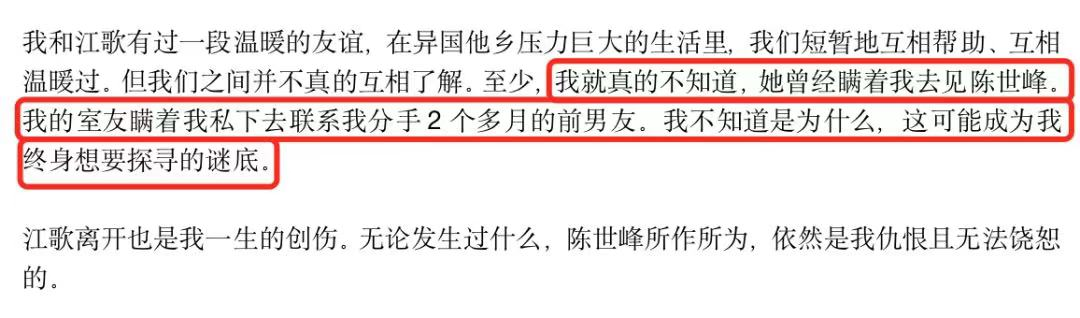 劉鑫從前至少不説江歌壞話,到如今又是造謠江歌與自己是同性戀人,又是無憑無據暗示江歌與陳世峯暗通款曲,抹黑江歌為小三,不是因為她當真認為江歌是如此人。