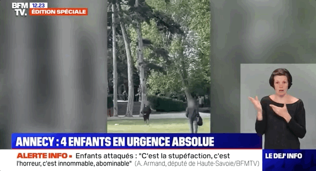 據BFMTV的説法,現場視頻似乎顯示,襲擊者專門在遊樂區尋找兒童,然後刺傷受害者,現場一名男子多次試圖阻止襲擊。