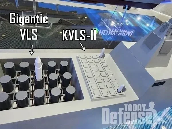 而在艦橋後方才是真正的“武器堆砌”,緊貼艦橋後方的是兩組、16單元的大型垂直髮射系統,似乎是韓國在2020年前後完成研製的K-VLSII型垂直髮射系統。相比K-VLS型,K-VLSII型垂髮的設計目的主要是為了兼容大型戰術導彈,比如韓國自行研製的“玄武-3”型巡航導彈等。