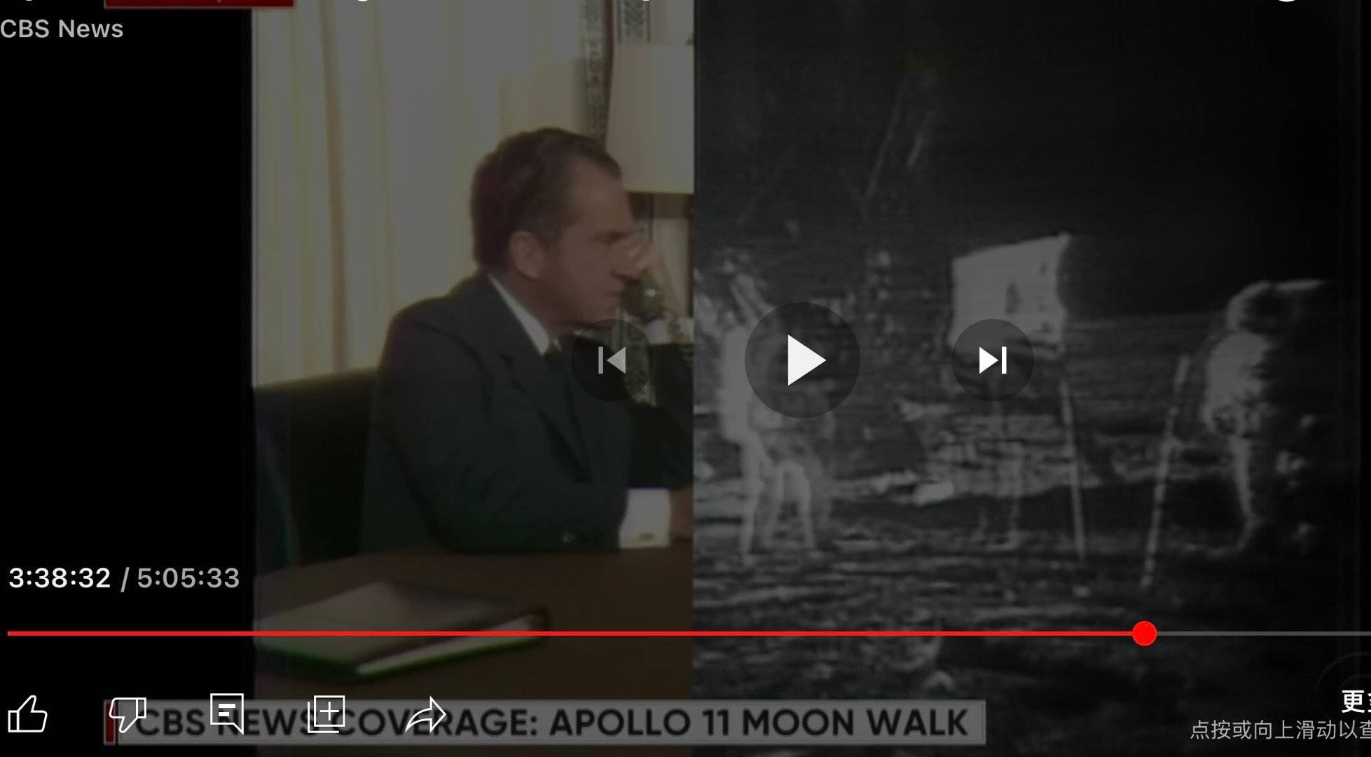 第一個是美國CBC登月直播5小時原始視頻(網頁鏈接 https://www.youtube.com/live/QBdyzTvA3oA?feature=share)這個是公眾現在看到最多的畫面,畫面左側是尼克松在白宮辦公室,右側是登月直播畫面,視頻裏尼克松通話結束在3小時38分32秒,而宇航員回話在3小時38分39秒,延遲6-7秒。(圖一)