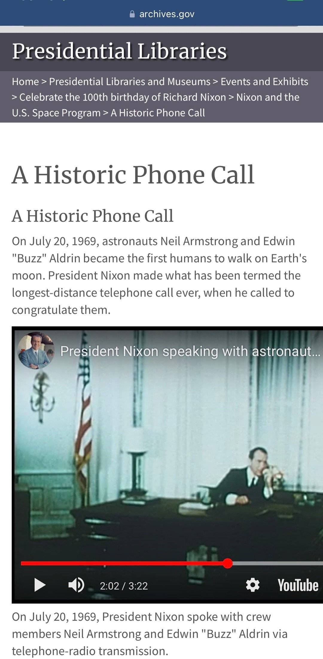 第二個視頻是美國總統圖書館存檔的現場原始視頻和錄音(網頁鏈接 https://www.archives.gov/presidential-libraries/events/centennials/nixon/exhibit/nixon-online-exhibit-calls.html):畫面主要是當時白宮辦公室的通話現場,尼克松説完話是在2分2秒,尼爾回話從2分9秒開始延遲6-7秒。(圖二)