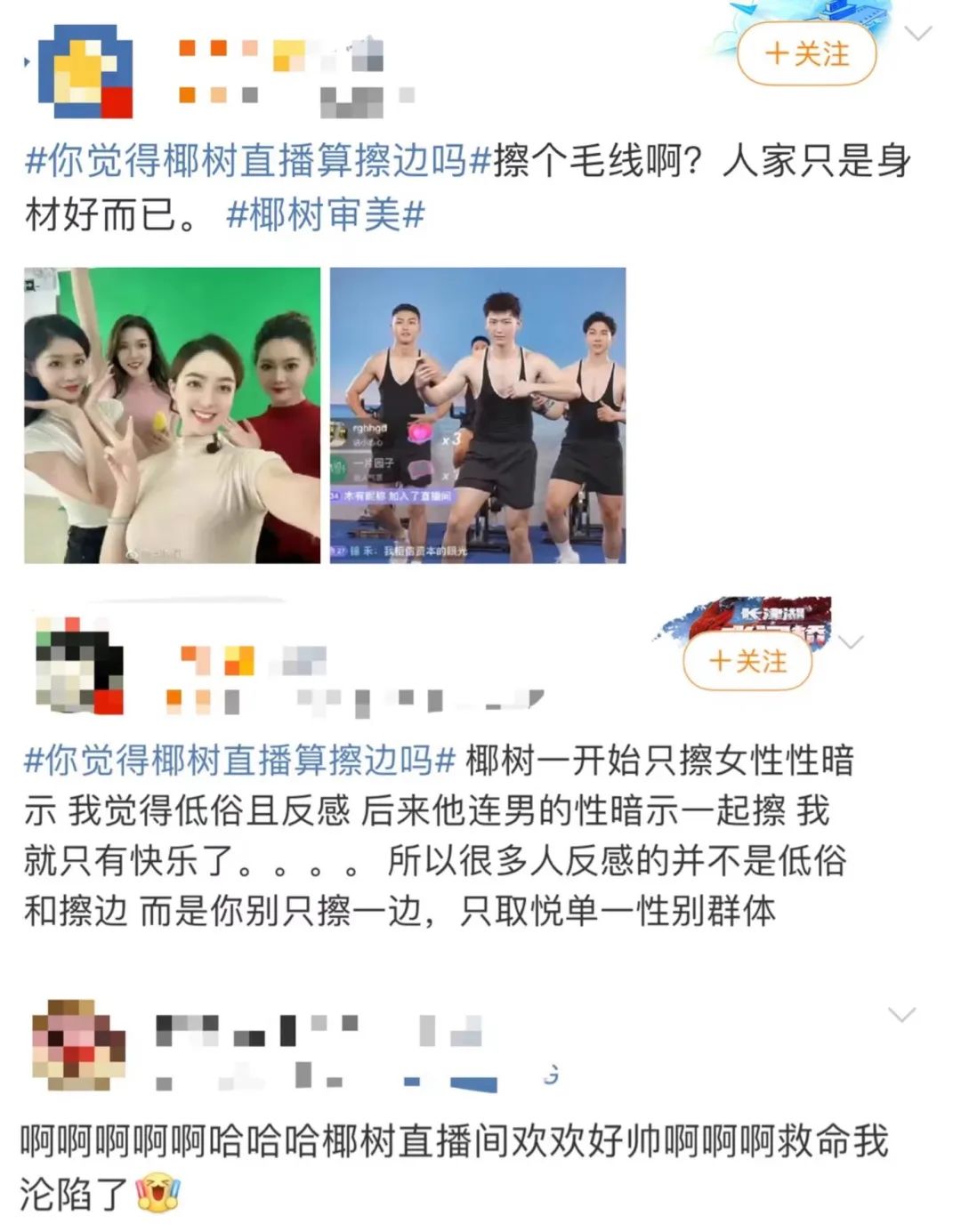 但不可否認的是,椰樹的男模團、女模團,確實在面臨不一樣的凝視。也許在椰樹直播間這份工作面前,男女主播被平等的“物化”,都在大方地調動着觀眾的荷爾蒙。但在輿論場上,確實沒有。這就像男偶像跳舞摸襠,會被贊“性張力”,女偶像跳舞摸胸,常常會被説“低俗”。