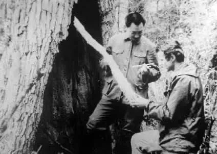胡錦矗(左)與喬治·夏勒在野外發現大熊貓“珍珍”在一棵空心樹中的產仔洞穴