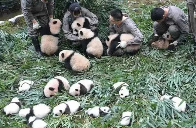 中國大熊貓保護研究中心雅安碧峯峽基地中工作人員正在看護大熊貓幼崽