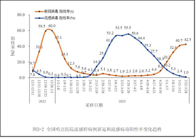 5月底的哨點醫院檢測的陽性率是42.5%,低於去年12月峯值的60%。