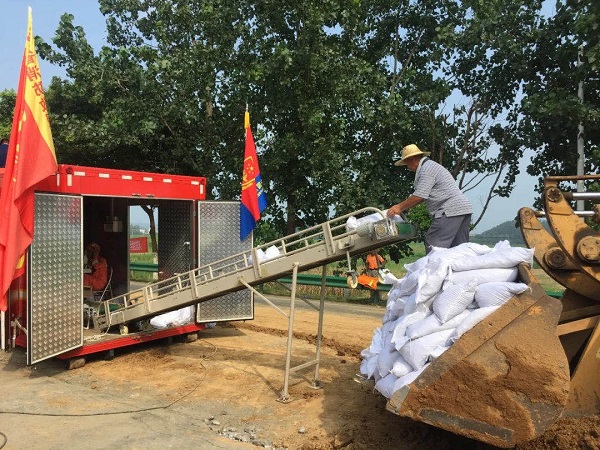 以往人力製作一個防汛沙袋需要三個人協作:一個人鏟沙,一個人提袋,另外一個人進行封口。現在利用沙土裝袋機配合輸送帶,可以實現從砂石的裝填、入袋、封口、打包、輸送全自動作業,極大的節約人力,並降低封堵缺口、構築子堤等搶險作業的安全風險。