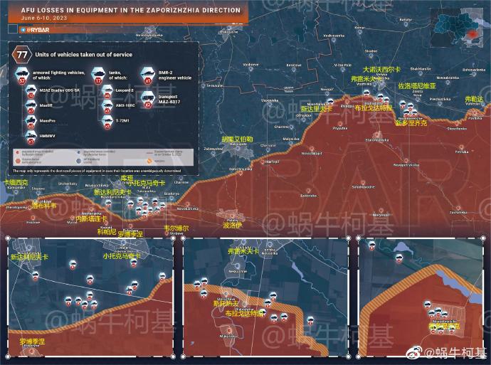 在分析了網絡上發佈的照片和視頻後,Rybar 團隊編制了過去幾天烏克蘭設備在 扎波羅熱方向損失的地圖。