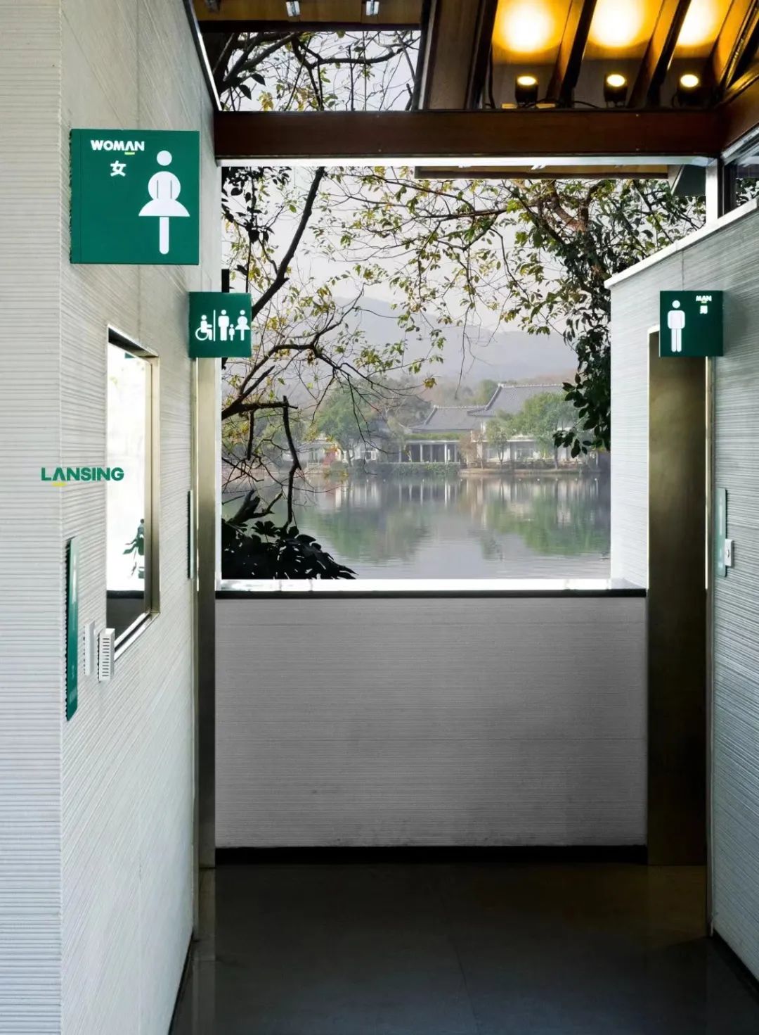 **它有一個古樸且温婉的名字“蘭心”。**西湖邊還有兩座相似的蘭心公廁,一座在蘇堤鎖瀾橋與望山橋之間,另一座位於湖濱音樂噴泉附近。很難用一個側面去定義這座廁所,它既有宋代古韻的歷史感,又有現代玻璃的技藝;既有古樸的松樹裝飾,又有數字化的LED屏幕管理。