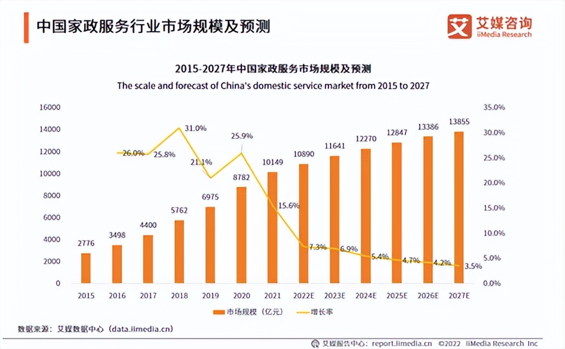 據艾媒諮詢統計顯示,從2015年到2021年,中國家政服務市場規模由2776億元增至10149億元,增長近4倍,預計2023年將達到11641億元,從業人員超過4000萬人。