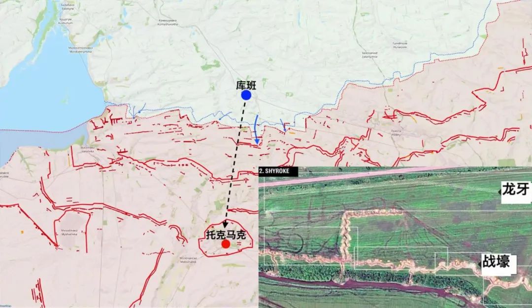 圖上密密麻麻的紅線,全部都是俄軍構建的戰壕,最長的一條連綿70公里。烏軍現在還處於俄軍的第一道防線位置,尚未突破第二道防線。從庫班到托克馬克的總距離也就20多公里,開車的話一腳油門就到了。可是,對烏軍而言,這是一道道“鋼鐵之牆”,每跨越一道防線,都要丟下無數具屍體,讓鮮血染紅前進的道路。