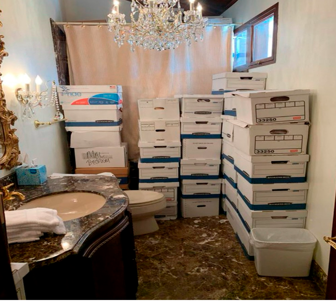 起訴書稱,川普的一些文件箱子被存放在海湖莊園的一個鍍金舞廳裏。起訴書中的一張照片顯示,舞廳的舞台上堆放着成排的箱子。
