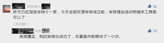 在上一篇文章發出之後,獲得了許許多多關心動物保護的讀者的支持,很多人立刻就行動了起來,紛紛開始舉報淘寶上在售的電子獵套。