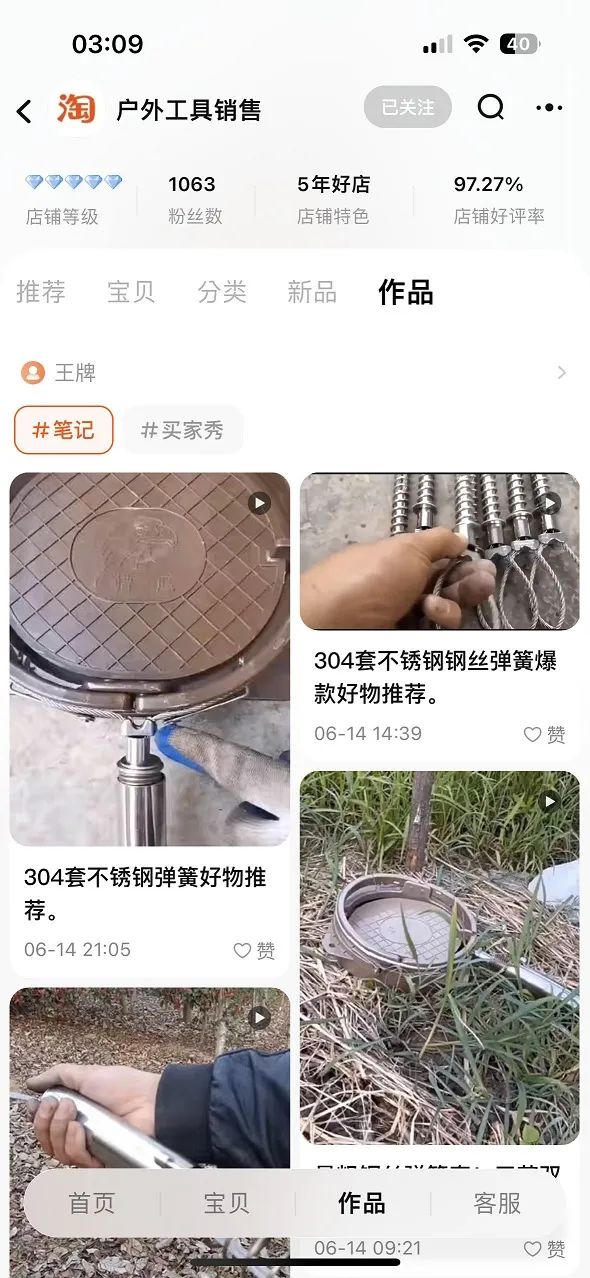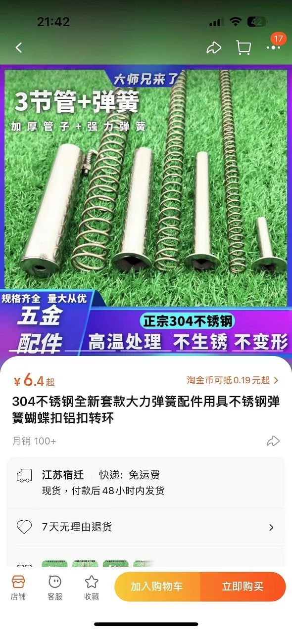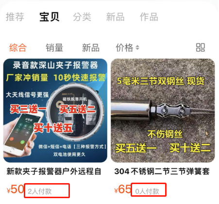 2.換個關鍵詞,以“二師兄套”、 “户外五金”等關鍵詞去搜索商品,還是能搜到這些違法工具的。你甚至都不用換關鍵詞,繼續用“彈簧索套”去搜,只是商品數量少了,但仔細點分辨的話,其實搜索結果裏還是有獵套的,只是不法分子把商品圖換成了拆解開的獵套,他們顯然發現有必要躲避平台的審查了。其實偽裝成這樣,淘寶的審核看不出來也算情有可原,而且審核都看不出來,很多潛在消費者當然也看不出來,當然考慮到還有大量的“回頭客”存在,所以這些條目該下架還是得下架。無論如何,這些不法分子可以在淘寶躺着賺錢的輕鬆日子一定是一去不返了。