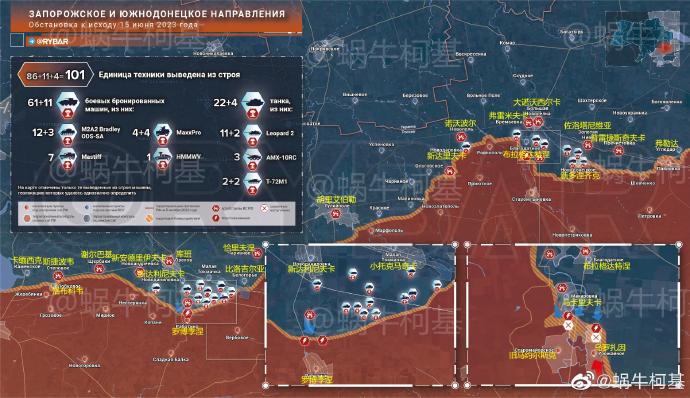 “烏軍至少在三個方向繼續反攻行動,據報道在 6 月 15 日取得了進展。自反攻開始以來,烏軍在扎波羅熱州西部的小托克馬奇卡附近推進了 3 公里,在頓涅茨克州西部的 大諾沃西爾卡附近推進了 7 公里,並解放了 7 個定居點。 然而,烏總統辦公室顧問於 6 月 15 日表示,烏軍尚未發動反攻。 ”