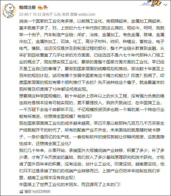 由於供應鏈和工業化是發展的一體兩面,所以這次就合併講解。6月7日,@懶得註冊 做了個解釋,在微博上引起了一波討論: