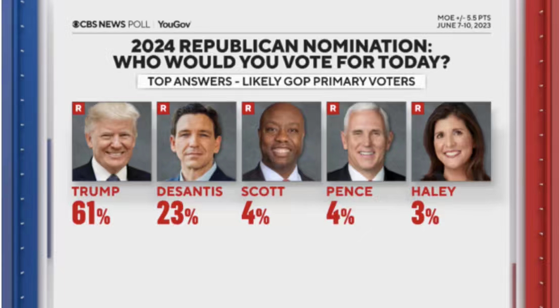 第一,為什麼特朗普會在共和黨初選必勝無疑?因為特朗普其實已經不是一般的政治人物,他成為一種文化現象了,所以作為白人中下層人民的偶像,他無論做什麼事情都是可以的。他已經是有光環的,像不粘鍋,雖然這次私藏機密文件證據確鑿,但是他的粉絲們完全不在乎,幾乎認定就是被誣告的,要劫他法場也可以。他的最新民調在被起訴之後居然領先桑德斯40%,而之前只有20%。(參見下圖)美國的選舉文化就是一種注意力的競爭,這次他被起訴以後,許多人的注意力被完全放到特朗普身上了,讓共和黨的其他候選人頓時光芒暗淡許多。所以,對黨內初選,特朗普贏定了。