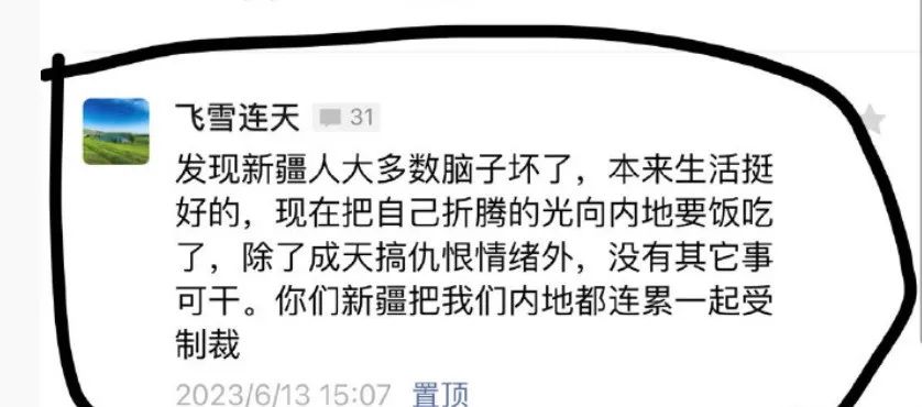 “發現新疆人大多數腦子壞了,本來生活挺好的,現在把自己折騰的光向內地要飯吃了,除了整天搞仇恨情緒外,沒有其他事可幹。你們新疆把我們內地都連累一起受制裁。“這句話的前半段如果説是一種個人消極情緒的釋放,後半段倒是可以好好分析。
