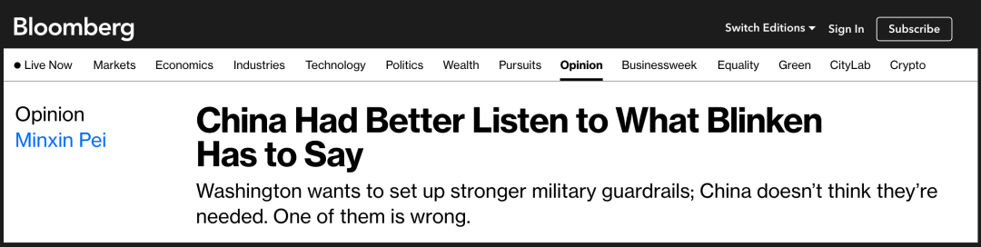 ▲**2023年6月16日,彭博社發表美國學者裴敏欣的署名文章《中國最好聽聽布林肯怎麼説》。**今天就從裴敏欣的文章説起吧。先説作為智庫學者,其作用是為美國政府出謀劃策,而不是對中國指點江山。裴先生明顯沒有搞清楚自己的定位。**説得糙一點,頗有點主人還沒張嘴,家犬衝你狂吠的感覺。**也難怪,當前美國政治圈爭相對華比狠鬥勇,這篇文章的調性也不過是“寒蟬效應”的體現。文章信息量不大,核心意思就幾層: