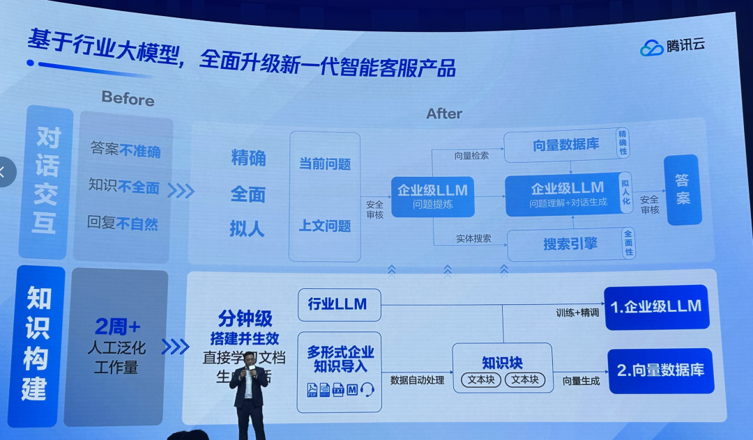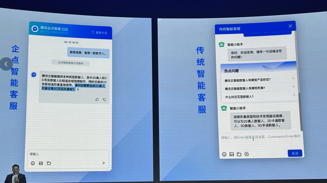 騰訊會議的AI助手功能,以及騰訊企點呈現出在此輪AIGC浪潮之後的改變。其中騰訊企點智能客服的效果與傳統智能客服產生了差異化的進化。