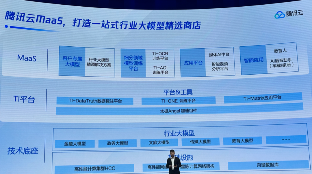 騰訊雲副總裁、騰訊雲智能負責人、優圖實驗室負責人吳運聲發表《騰訊雲MaaS,打造一站式行業大模型精選商店》的主題演講,分享了騰訊雲在行業大模型方面的技術方案,以及產業客户實踐、行業大模型標準體系構建的進展。