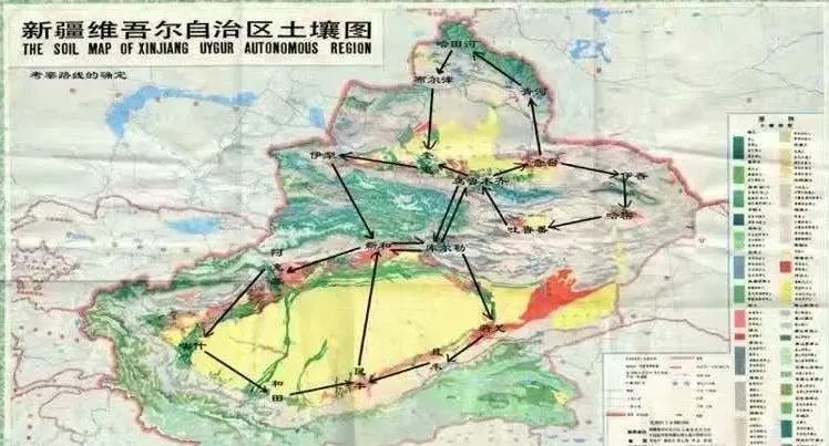 下面這是我們在新疆用了三年時間進行調查的路線。我們跑遍了南北疆和東疆平原區所有有鹽鹼的地方,取了100多個樣方,挖了很多剖面。