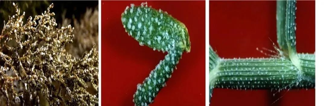 第二類植物叫泌鹽植物,它能通過葉片和莖上的鹽腺把吸收進體內的鹽通過蒸騰作用及時分泌出來(上圖)。到了一定的程度時,它的葉子就會掉落,以保持旺盛的生長的能力。但是這類植物只能使土壤鹽分在原地循環,可以保障自己生長,但是不能把鹽排走。