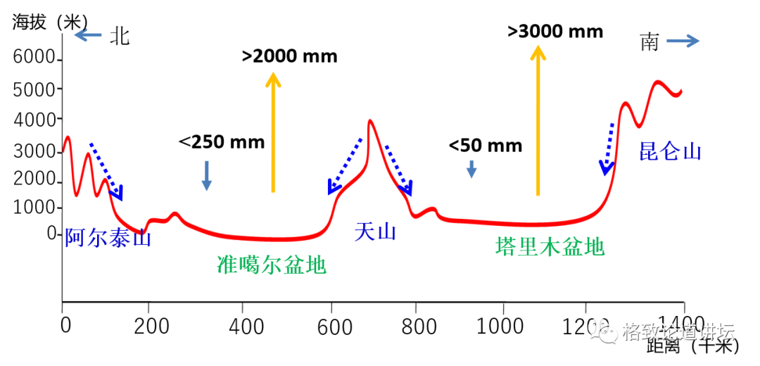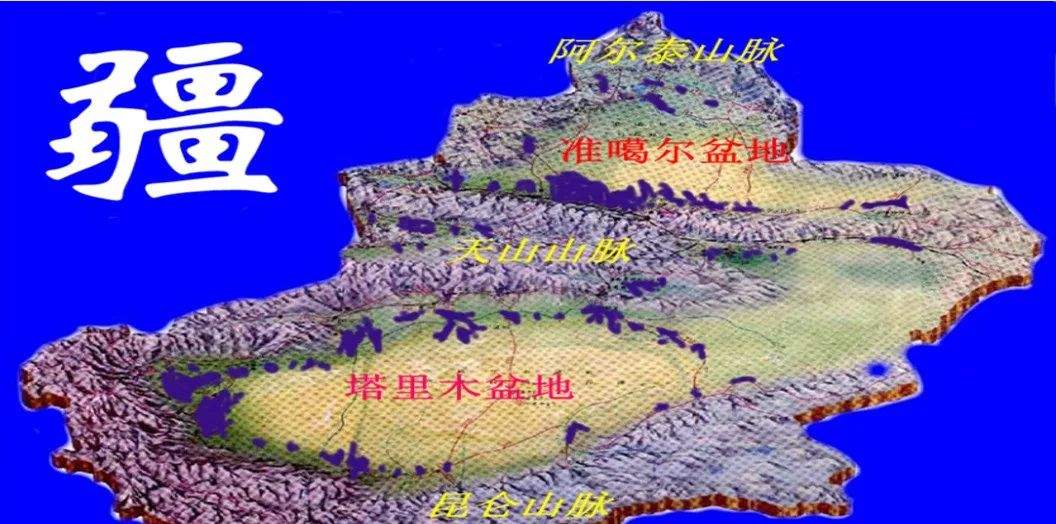 第一,新疆的地貌格局是三山夾兩盆——北部的阿爾泰山、中部的天山和南部的崑崙山之間夾了準噶爾盆地和塔里木盆地兩個盆地。這兩個盆地都是封閉性的。所以從大的地貌格局上來講,新疆形成了封閉性的內陸盆地。