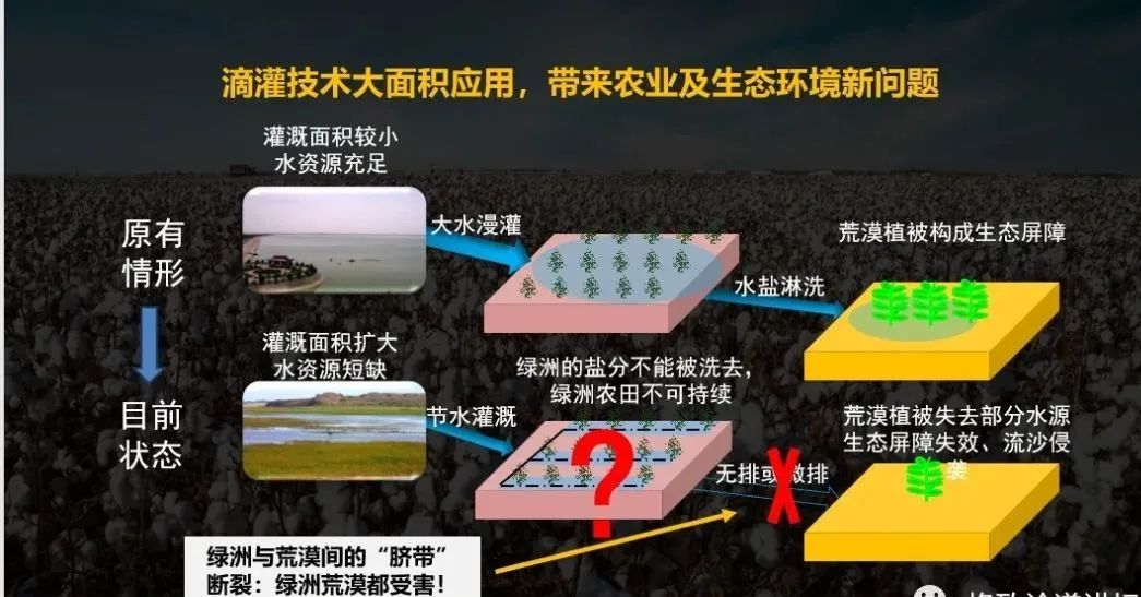 現在,新疆的滴灌面積已經佔到大多數綠洲區的80%,大面積滴灌也使新疆的耕地增加了一倍、作物增產30%以上。因此,滴灌的誘惑力是十分巨大的。但是,滴灌只能造成土壤中植物的根層淡化,不能把鹽排出土體。隨水而來的鹽無法隨水而去,土壤就會積鹽。