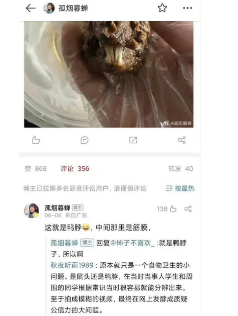 看看這位,是事件之初和胡錫進是一個説法。當然他和胡錫進一樣,都算老滑頭了,都有所保留。胡錫進説相信市監局沒有動機造假,但也説了“感覺酷似鼠頭”,這位也沒有把話説死,但他給市監局洗地的意圖很清楚。搞笑的是,銷燬最初鼠頭鴨脖的是學校食堂,是他們第一時間搶先銷燬證據,妄想死無對證,結果這位俠士説是“市監局檢驗完之後,認為那玩意兒留下來沒有意義,於是就把檢品給扔了”