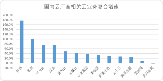 近幾年運營商的雲業務收入保持在70%-180%之間的複合增速,幾乎是連年翻番。阿里實際增速並不慢,但因為先發優勢,基數較大,增速稍遜於同行。