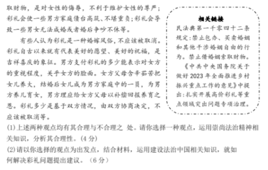 重慶市道德與法治中考真題顯示,有一道與彩禮相關的題,考生需根據材料,選擇一種觀點並分析其合理性。