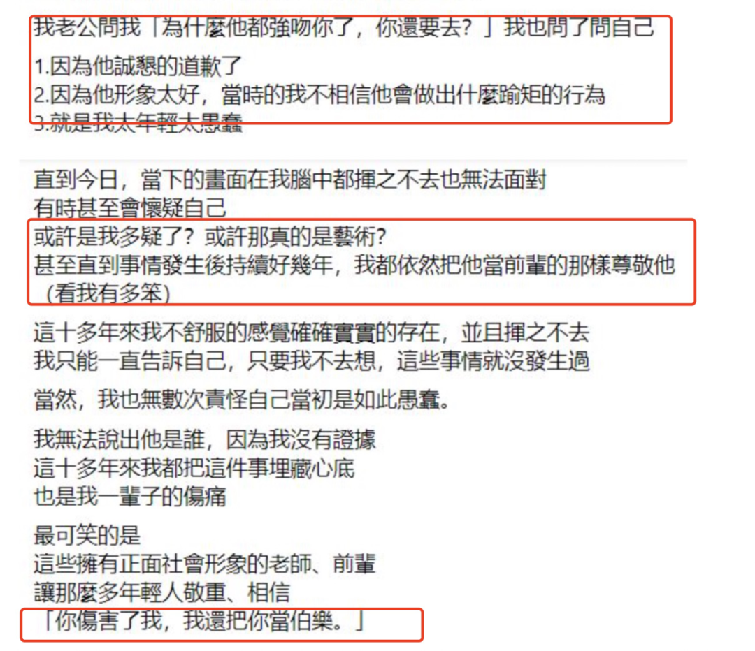 他在文中對自己二十多年來因為性騷擾他人所受的“迫害”大書特書,網友質疑他“明明身為加害者,卻奪取受害者的發言權”,而他卻委屈地回應“犯錯人真的不可能是另一種受害者?”