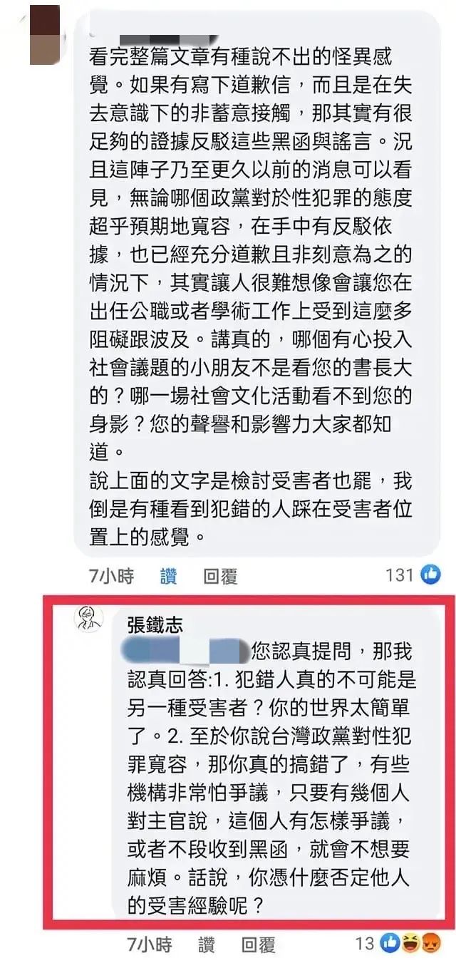 台灣知名樂評人張鐵志就曾在社交平台公開發文,坦誠自己二十年前“斷片觸碰學妹身體”,他稱自己事後就已經向對方道歉,但是“此事20多年來被無限扭曲、放大、流傳,變成另一個虛構故事”,“然後幾乎摧毀我的真實人生”。