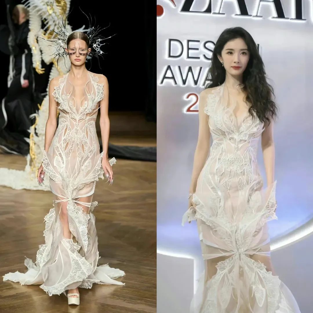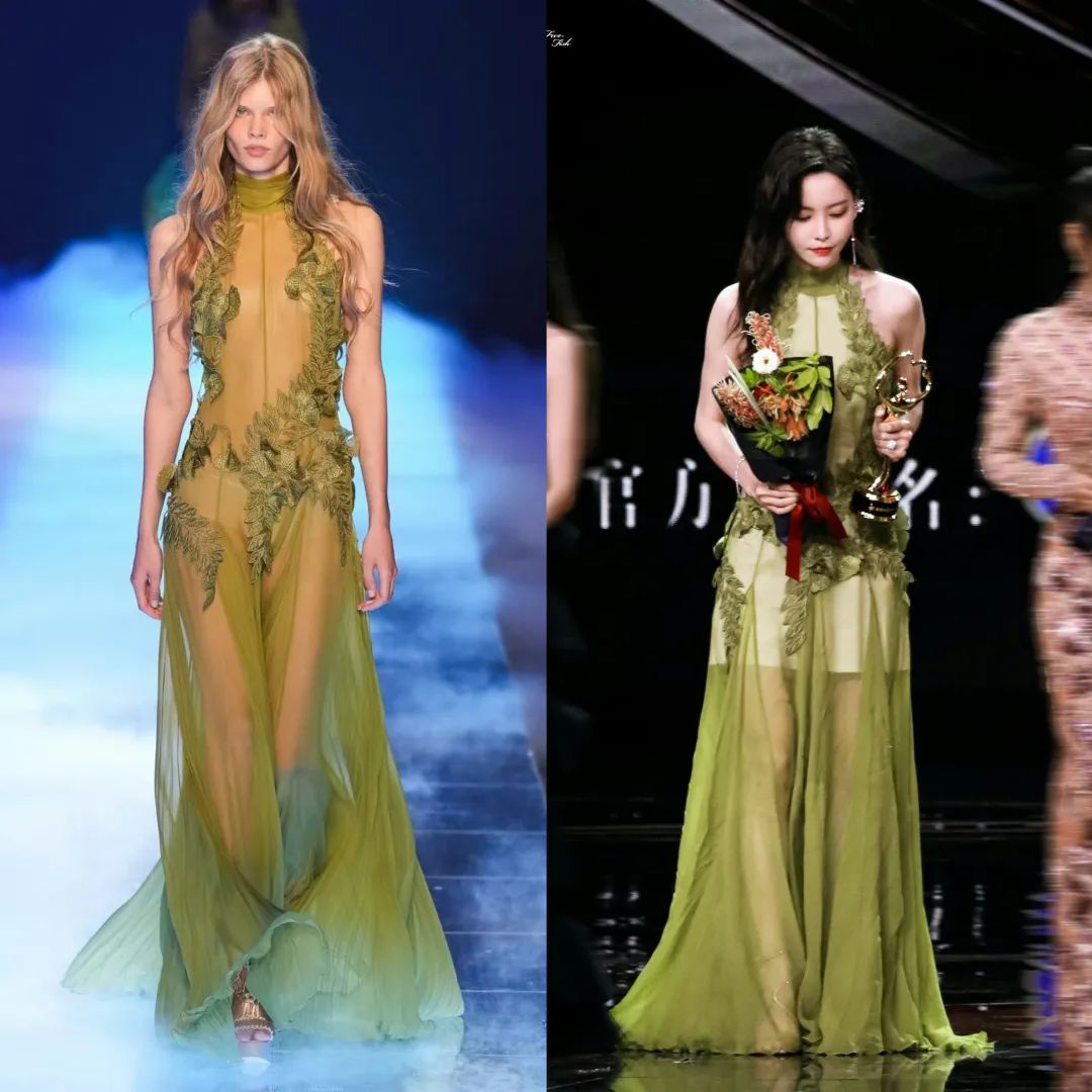 楊冪這套還算好,但也是把胸口擋得嚴嚴實實。禮服原本的妖冶性感被完全剝離,只剩下了中規中矩的美麗。
