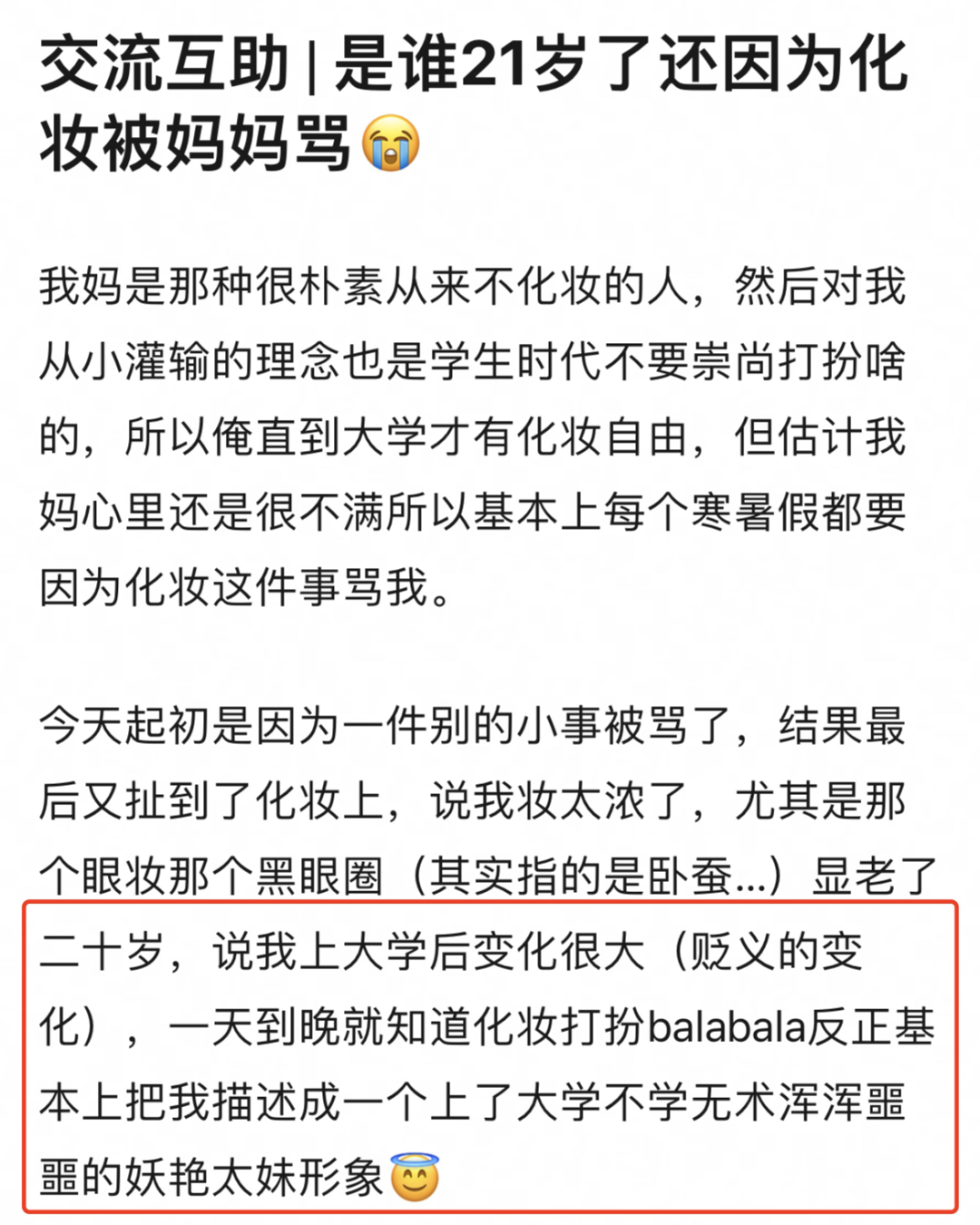 有女孩讀大學後學會了化妝,但回家之後,卻被媽媽看作“妖豔太妹”“不學無術”。