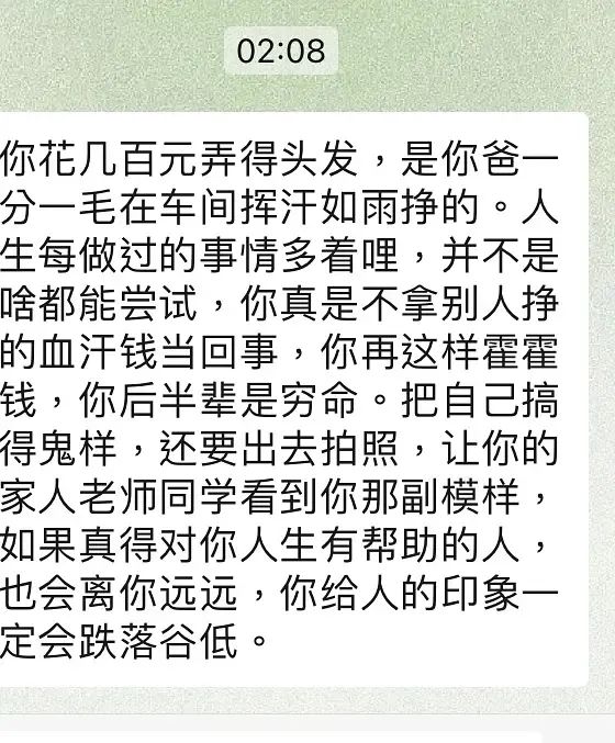 有人因為染了個頭發,被家人發來長篇大論的指責,從錢的用度來道德綁架,更上升到“你給人的印象一定會跌落谷底。”